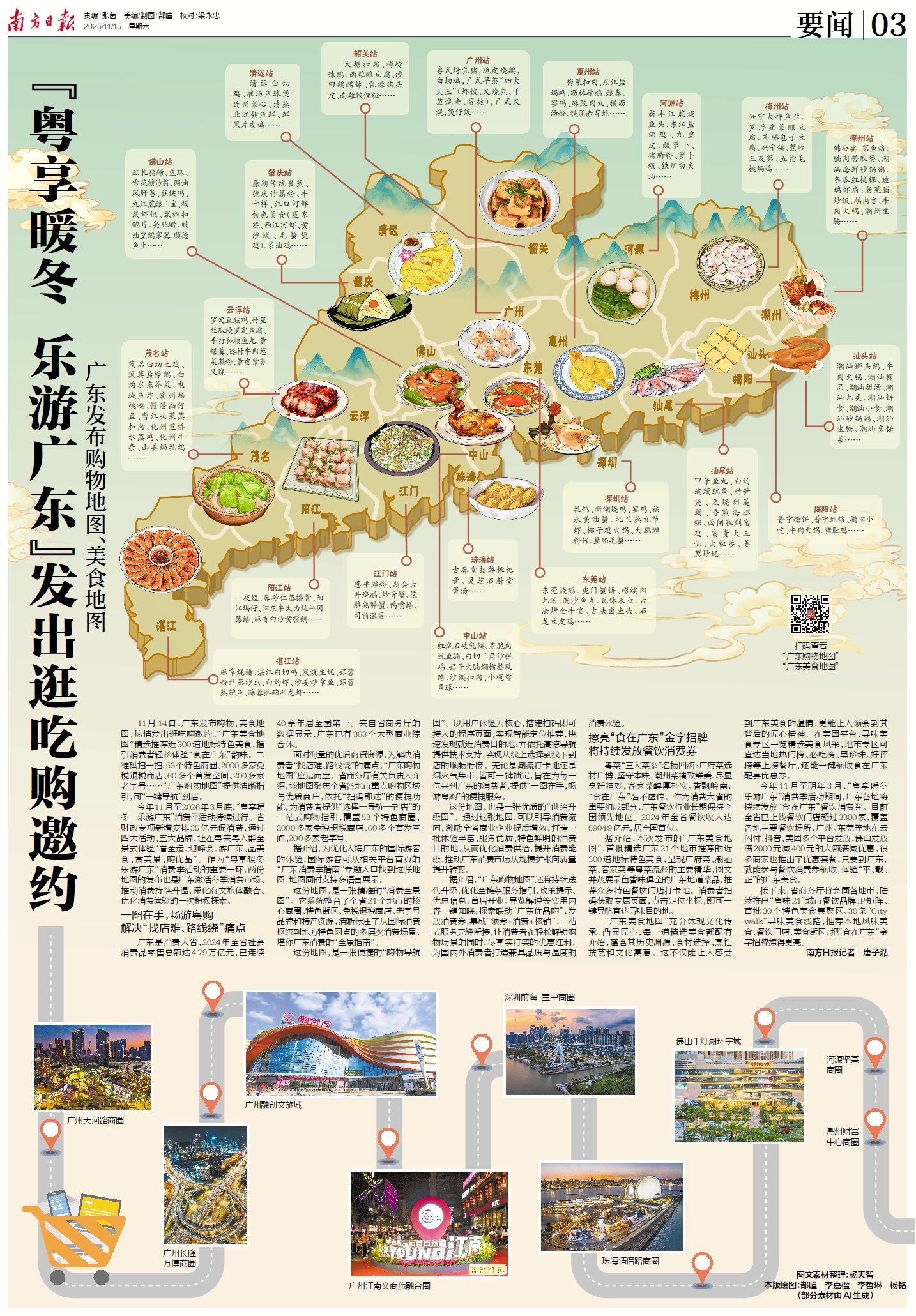 今年11月至2026年3月底,“粤享暖冬乐游广东”消费季活动持续进行。省财政专项新增安排35亿元促消费,通过四大活动、五大品牌,让在粤来粤人群全景式体验“看全运、迎峰会、游广东、品美食、赏美景、购优品”。作为“粤享暖冬乐游广东”消费季活动的重要一环,两份地图的发布也是广东激活冬季消费市场、推动消费持续升温,深化商文旅体融合、优化消费体验的一次积极探索。